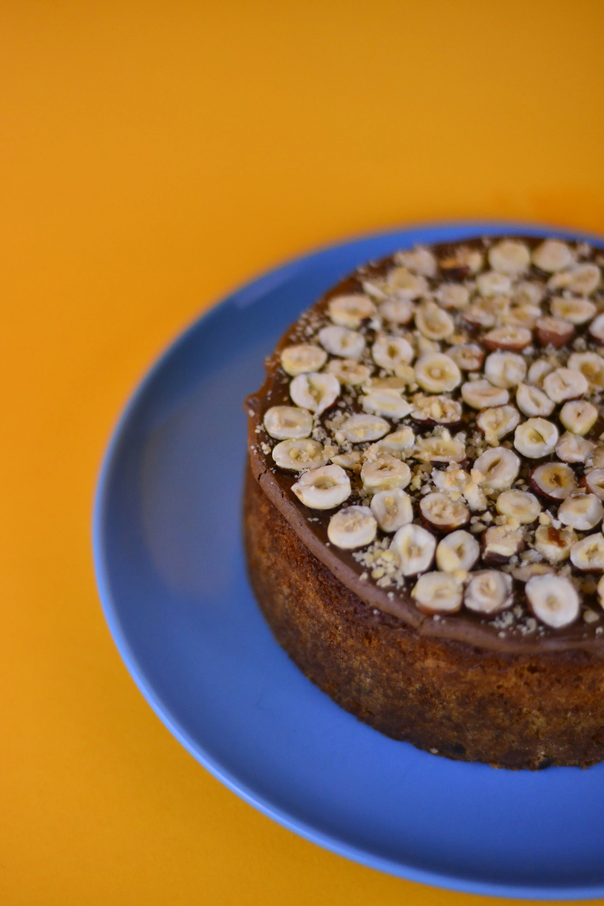 A roasted Hazelnut, Espresso & dark Belgian Chocolate sponge cake with a Belgian chocolate Ganache and decorated with candied Hazelnuts.